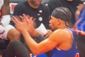 GIF-哈特投进三分后对着猛龙替补席突突突 被毛巾砸脸
