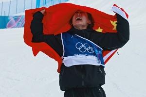 赛后苏翊鸣身披国旗激动庆祝,在颁奖典礼上,苏翊鸣自信比“1”同时再度落泪。