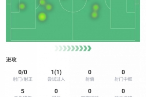 触球43次、传球39次成功率87.2%、长传5次成功60%