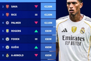 体育资讯3月16日讯 在公布了新一期的西甲球员身价情况后,德国转会市场盘点了英格兰球员身价top10,贝林厄姆以1.4亿欧居首,阿森纳两将萨卡和赖斯以1.2亿欧并列次席。