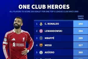 体育资讯11月2日讯 英超第10轮比赛,萨拉赫破门,利物浦主场2-0击败维拉。萨拉赫各赛事为利物浦攻入250球,德国转会市场统计了本世纪五大联赛球员为单一俱乐部攻入250球所用场次,并列出榜单。