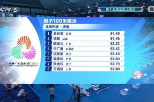在今晚进行的全运会游泳男子100米蝶泳决赛中,天津队王长浩51.40秒获得金牌,山东队徐放51.46秒获得银牌,广东队陈俊儿52.32秒获得铜牌。