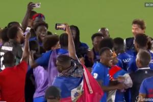 在比赛结束后,海地球员围在一起等待哥斯达黎加vs洪都拉斯的结果。在哥斯达黎加vs洪都拉斯比赛结束后,海地球员疯狂庆祝。