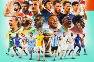 42位代表各自队伍的球星出现在了这张海报上,包括梅西、J罗、凯恩、哈兰德、萨拉赫、姆巴佩等球迷耳熟能详的足坛明星。