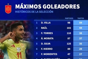 体育资讯11月20日讯 德国转会市场列出西班牙队史射手榜,比利亚59球居首,费兰-托雷斯23球第10位,奥亚萨瓦尔打进22球。