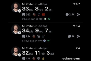 数据美媒Real Sports晒出小波特本赛季30+场次(5次)数据,并写道:“进攻头号选择的小波特。”
