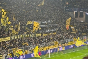 体育资讯11月26日讯 今天凌晨,多特在欧冠大胜比利亚雷亚尔,多特球迷在比赛中拉起横幅,与比利亚雷亚尔球迷一同反对西甲海外赛。