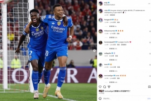 本场比赛姆巴佩上演大四喜,维尼修斯也送出两次助攻。赛后维尼修斯社媒晒出与姆巴佩庆祝合影,配文写道:“一场大胜,姆巴佩独中四元,取得欧冠第27次助攻,未来还有更多!”