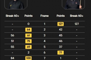 诺鹏·桑卡姆打出单杆127分,庞俊旭打出56、51、55、84分共四杆50+,最终庞俊旭以6-2的比分战胜诺鹏·桑卡姆,晋级英锦赛正赛。