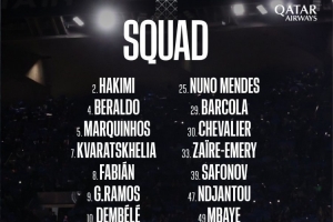 前锋:7-克瓦拉茨赫利亚、9-贡萨洛-拉莫斯、10-登贝莱、19-李刚仁、29-巴尔科拉、47-恩贾恩图、49-姆巴耶
