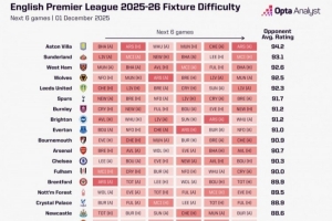 体育资讯12月2日讯 opta分析了英超各队未来6轮的赛程难易程度,维拉赛程最为艰难,利物浦最容易。曼城第二容易,曼联并列第三容易。