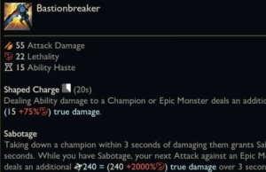 你过去三秒内伤害过的敌方英雄死亡会为你提供一个破坏效果,你对史诗级野怪或者防御塔的下一次攻击会消耗掉这个效果,造成基于穿甲的额外持续伤害