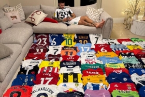 体育资讯12月5日讯 纽卡斯尔中场吉马良斯今天在Instagram发照片,晒出了自己的球衣收藏。
