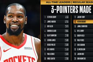 本场比赛,杜兰特达成两项里程碑,除了生涯突破31000分外,他的三分命中数(2223)也超过贾马尔·克劳福德(2221),独享历史第12名。