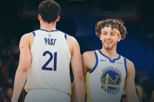 赛后勇士官方晒出本场赢球海报,封面人物是波杰姆斯基和波斯特。