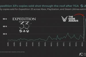 据Alinea Analytics数据分析显示,该作在TGA夺奖后,每日销量立即飙升至此前的6倍。颁奖礼结束后,游戏累计新增销量超20万套,总销量正式突破600万套大关。