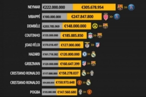 1. 内马尔(巴萨 → 巴黎),原2.22亿,现3.057亿