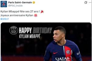 体育资讯12月20日讯 今天是法国前锋姆巴佩27岁生日,他的老东家巴黎圣日耳曼在社媒为姆巴佩送上生日祝福。