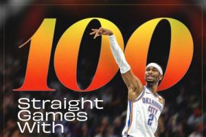 这也是亚历山大连续100场得分上双,继续追逐NBA历史第一的张伯伦(126)。