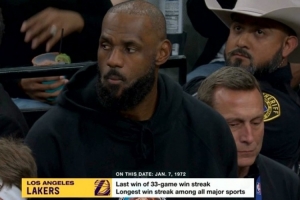 湖人对阵马刺,转播方给出统计,1972年的今天,湖人33连胜,创造北美体育主要联赛的连胜纪录。