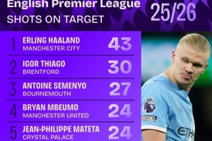 体育资讯1月10日讯 数据机构squawka统计了本赛季英超射正情况,哈兰德居首。