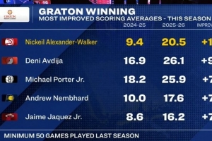 老鹰客场挑战勇士,转播方给出本赛季场均得分涨幅排名: