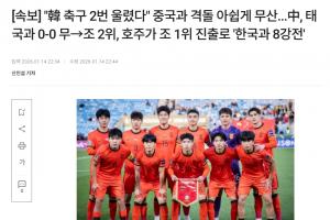 韩媒标题为:韩国足球两度饮恨 与中国对决遗憾落空(中国0-0战平泰国获小组第二 澳大利亚头名晋级将与韩国会师八强战)