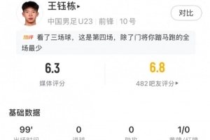体育资讯1月17日讯 U23亚洲杯1/4决赛,国足vs乌兹别克斯坦,王钰栋为U23国足首发出战,加时赛第9分钟因体力耗尽被换下,最终获评6.3分。