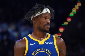 第三节比赛中,勇士球星巴特勒对抗后倒地捂着右膝表情痛苦,随后在队友搀扶下离场。