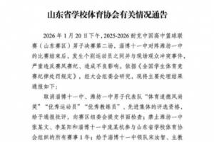 新华社济南1月22日电(记者张武岳、韦骅)记者22日从山东省学校体育协会获悉,针对20日在2025-2026耐克中国高中篮球联赛基层赛(山东赛区)男子决赛第二场淄博十一中队和潍坊一中队赛后发生的冲突事件,依据《全国学生体育竞赛纪律处罚规定》,大会组委会研究后,作出对部分球员禁赛、取消淄博十一中的比赛承办资格等处罚决定。