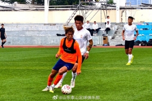 今天下午,在海口冬训的山东泰山队与青岛西海岸队进行了一场热身赛,本场比赛上下半场各35分钟。泰山队由刘骐玮、王彤、赵剑非、杨瑞琦、吴兴涵、梅帅军、尹嘉熙、邓淳泽、陈蒲、路俊伟和买乌郎首发。上半场陈蒲中路断球后直塞邓淳泽,后者面对守门员打门偏出立柱。此后双方互有攻守,以 0:0 的比分结束上半场比赛。下半场,泰山队做出换人调整,刘彬彬、郑铮、王昊斌和闫恒烨替补登场。青岛西海岸队率先在混战中抢射破门,一分钟后陈蒲造点并亲自主罚命中扳平比分,临近比赛结束,青岛西海岸队抓住反击机会打入一球完成反超。最终山东泰山1:2不敌青岛西海岸。