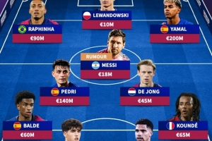 前锋:拉菲尼亚、莱万、亚马尔