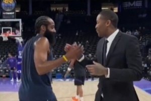快船官方晒出哈登赛前与前快船球员克劳福德和布拉德利互动的视频,配文:“快船队的过去与现在🤝。”