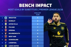 体育资讯1月28日讯 德国转会市场统计了本赛季各队替补球员在英超比赛中的进球数量,并列出榜单,布莱顿9球居首,曼城、曼联1球垫底,曼联替补球员唯一的进球就是库尼亚对阵阿森纳的制胜球。